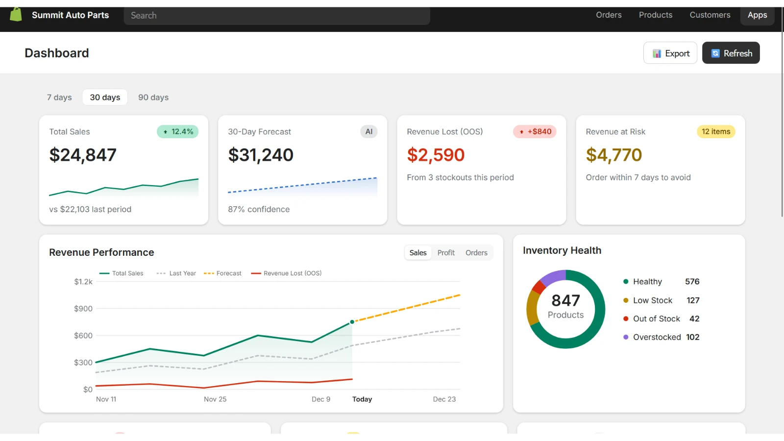 Total sales, AI-powered 30-day forecasts, revenue at risk, and inventory health — all at a glance.